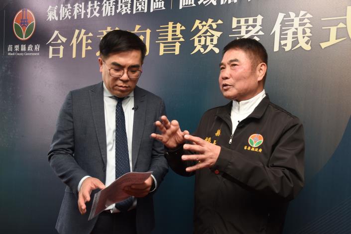 環境部透過氣候科技循環園區推動計畫,率先選定苗栗縣政府協助推動循環設施設置;全國第一場簽署儀式今天上午在縣府國際會議廳舉行,雙方代表為環境部長彭啟明和苗栗縣長鍾東錦,完成簽署後象徵中央與地方共同為「資源循環零廢棄」戰略立下重要里程碑,聯手推動區域平衡發展與環境永續決心。彭啟明則率簡任秘書李淑芬、資源循環署長賴瑩瑩、副署長林健三及組長陳俊融等幹部,鍾東錦帶領竹南鎮長方進興、環保局長陳華盛、副局長沈鳳臺等人出席,另有縣市環保局、資源循環產業聯盟及廢棄物清除處理商業同業公會代表,一起見證關鍵時刻。