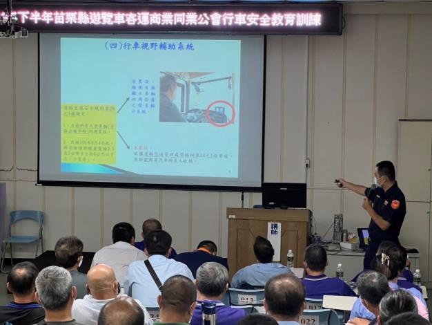 警察局交通警察隊派員至苗栗監理站道路交通安全講習教室向縣內約120位大型車職業駕駛人宣導行車前應養足精神、檢查行車紀錄器(俗稱大餅)及行車視野輔助系統等相關機件有無正常運作,避免行駛道路突然發生故障,另行駛中切勿違規超速、超載、闖紅燈及疲勞駕駛(連續駕車超過八小時)等行為,行車後應妥善保存相關錄影佐證資料,俾利日後調閱之需。