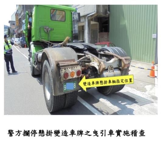 苗栗縣警察局交通警察隊於本(8)月9日執行巡邏勤務,在苗栗縣造橋鄉台1線與台13甲線交岔路口發現1部營業貨運曳引車懸掛牌照非比尋常,隨即鳴笛示意駕駛人暫停路旁安全處所接受警方稽查,警方仔細檢視該車牌照,赫然發現係用塑膠底板變造車號。