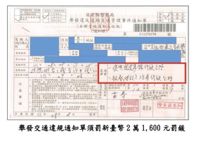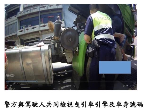 交通警察隊同仁當場與駕駛人共同檢視該曳引車引擎及車身號碼,經比對車牌號碼吻合,便依據道路交通管理處罰條例第12條規定:舉發駕駛人變造汽車牌照及使用報廢登記之汽車行駛道路,處罰汽車所有人新臺幣2萬1,600元罰鍰,並禁止其行駛、扣繳牌照及沒入車輛,俾利監理單位辦理後續銷毀事宜。