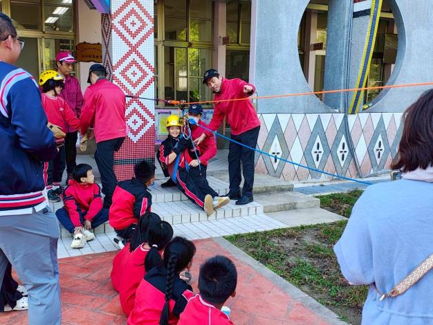 活動安排如下:首先由泰安分隊架設的橫渡架設體驗,學生穿戴半身式吊帶,沿緊繃繩索軌道安全滑行,親身感受高空裝備與安全要領;再來山域宣導則介紹山區行走注意事項與搜救流程,搭配義勇消防與山域搜救隊員現場示範,讓學童了解遇險通報與自救互救重要步驟;最後的室內消防栓射水體驗則先教導消防栓使用口訣,接著由學生實際操作,體驗滅火器材與團隊合作。