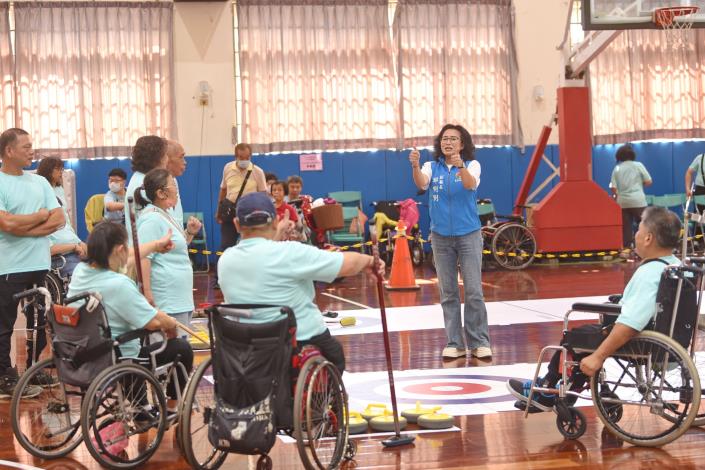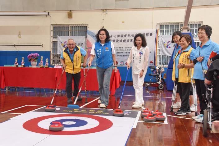 社團法人苗栗縣肢體傷殘自強協會主辦的114年度全國身心障礙者地板冰壺錦標賽暨節能減碳宣導,5日上午在國立苗栗高中活動中心登場,有來自5縣市15支隊伍逾百位帕拉選手參賽,也吸引不少家屬和民眾體驗趣味競賽;副縣長邱俐俐偕多位來賓到場主持「開壺」儀式,為參賽選手加油打氣,她數度豎起雙拇指肯定他們突破有形障礙展現無窮戰力的精神。