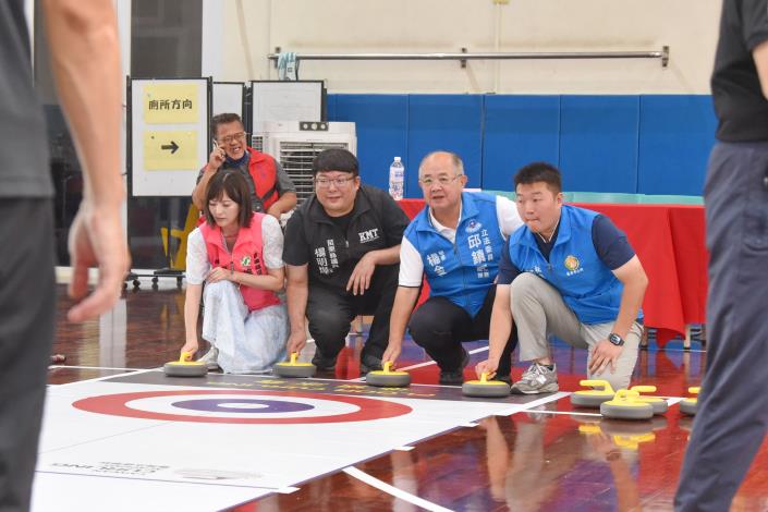 今天上午9時,副縣長邱俐俐、立委邱鎮軍秘書楊金福、副議長張淑芬助理劉瑞文、縣議員楊明燁、徐筱菁及市公所秘書邱威鳴等人出席開幕式,並分別在兩個球道主持「開壺」儀式,技巧、架勢都不輸選手,當冰壺精準落在「大本營」裡面時,立即響起熱烈掌聲。邱俐俐初到比賽場地,先繞場一周握手歡迎各縣市選手並為他們加油拉抬氣勢。