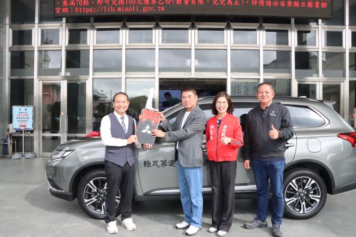 苗栗縣政府18日上午舉行「維瓦第建築團隊捐贈公務車儀式」,縣長鍾東錦偕同水利處長楊明饒、議員楊明燁以及縣政顧問許慧琴出席。縣長鍾東錦致贈感謝狀,感謝維瓦第建築團隊熱心公益,捐贈一輛四輪傳動公務車,供縣府辦理山坡地業務使用,以強化水土保持及坡地巡查的執行效能。此次捐贈由縣政顧問許慧琴女士居中牽線促成,充分展現地方人士關懷家鄉、凝聚資源的精神。