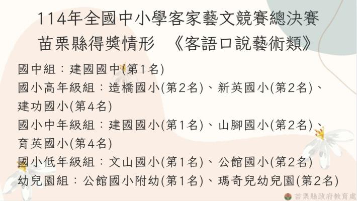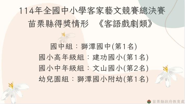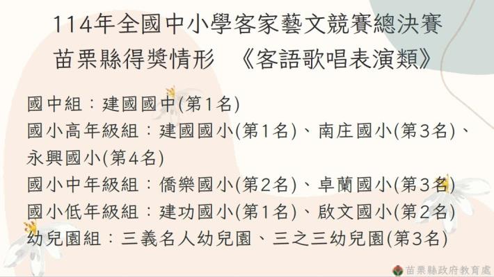 客家委員會自94年起舉辦第一屆客語生活學校觀摩賽至今,苗栗縣連年參賽,這次全國中小學客家藝文競賽,來自全國246校355隊參加歌唱表演、口說藝術及戲劇等三大類15項組別的初賽,全國共有86支隊伍進入總決賽,代表苗栗縣參賽的25支隊伍不負眾望,在三類競賽15項組別中總共榮獲10項第一名、8項第二名、4項第三名及3項第四名,得獎數全國(含六都)第一!得獎學校成績如下: