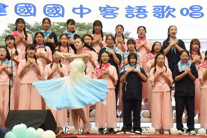 今日成果展由新埔國小獅隊的祥獅獻瑞與建國國中合唱團精彩開場,縣長鍾東錦罕見地表達觀賞心得和建議。鍾東錦說,「弄獅」是重要民俗文化,學生的祥獅獻瑞也相當精彩,但他建議按民間習俗,可以提供舞獅的靈魂人物一個猴子或大面鬼的面具,表演起來更傳神也符合民風色彩;在合唱團獻唱客家歌曲結束後,鍾錦突然來個「隨堂考試」,詢問來賓有多少人清楚了解內容?結果不如預期,他當場指示教育處協助配備字幕機,既可清楚顯示歌詞內容,也能帶動熱絡氣氛。