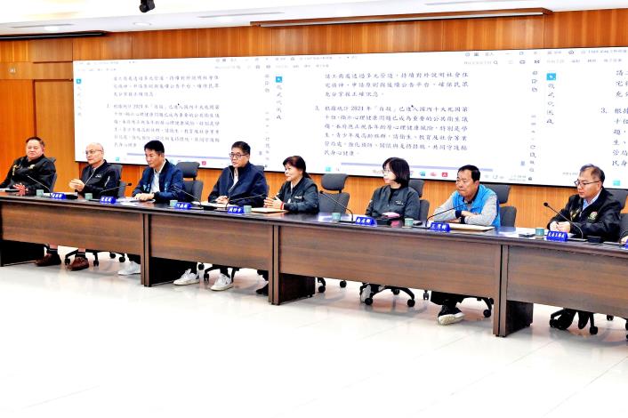 - 根據統計2024年「自殺」已進入國內十大死因第 十位,顯示心理健康問題已成為重要的公共衛生議 題,本府應正視各年齡層心理健康風險,特別是學 生、青少年及高齡族群,請衛生、教育及社會等業 管局處,強化預防、關懷與支持措施,共同守護縣 民身心健康。