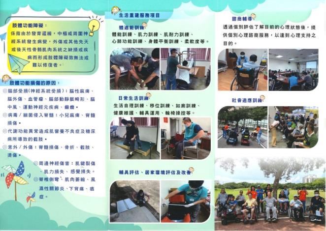 二、 服務內容:體適能訓練、日常生活訓練、輔具評估、居家環境評估及改善、諮商輔導、社會適應訓練等。