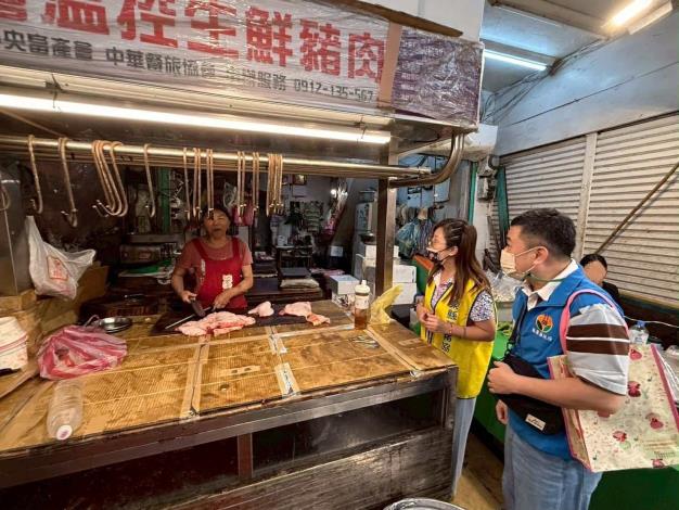 活豬禁運禁宰之禁令解除後,為落實非洲豬瘟(ASF)疫後市場秩序與食安管理,苗栗縣政府農業處今(8)日派員會同社團法人苗栗縣養豬協會曾惠玲總幹事,前往苗栗市南苗市場巡視,了解傳統市場豬肉買氣與攤商銷售情形,並向民眾宣導認明合法來源與合格屠宰的重要性。