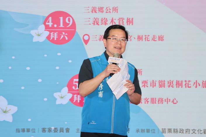 文化觀光局長林彥甫指出,苗栗的「桐花祭」與連江的「藍眼淚」攜手成為全臺觀光推動的重要亮點。桐花祭於4月19日至5月11日展開黃金兩週,同時也提到,4月19日將於三義西湖度假村舉辦「2025客家桐花婚禮」,歡迎縣民免費入場參與,感受客家文化的深厚情感與浪漫氛圍。