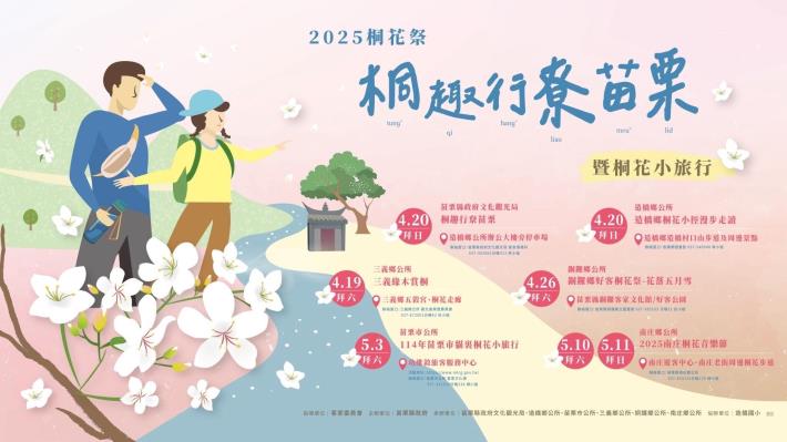苗栗縣五鄉鎮公所推出「桐花小旅行」特色遊程,包括造橋鄉的「桐花小徑漫步走讀」、三義鄉的「三義緣木賞桐」、銅鑼鄉的「好客桐花祭—花落五月雪」、苗栗市的「貓裏桐花小旅行」以及南庄鄉的「桐花音樂節」。這些行程結合深度導覽、音樂饗宴和在地手作體驗,讓遊客細細品味桐花的浪漫之美,活動每場次限額40人,報名時間為4月10日下午2點至4月18日中午12點,額滿為止。詳情請參考:https://reurl.cc/W0qRky。