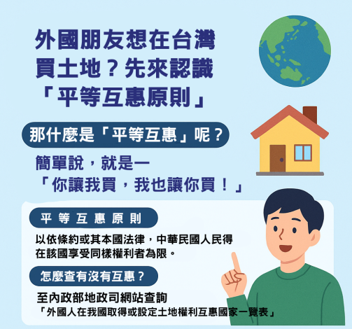 依據土地法第18條規定:「外國人在中華民國取得或設定土地權利,以依條約或其本國法律,中華民國人民得在該國享受同樣權利者為限。」故基於平等互惠原則,只有我國人民得在該外國人母國享有之土地權利,才允許該國人民依相同條件在我國取得、設定土地權利。例如,某國法律允許我國人民得在當地購買供住宅使用不動產,那該國人民就可以依此原則,申請在我國購買同類不動產。