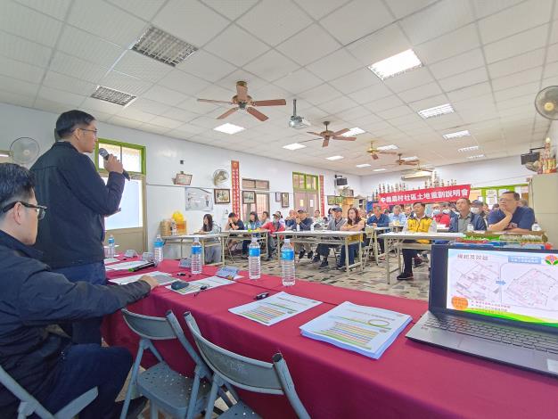本次說明會主要向居民說明農村社區土地重劃的目的、推動進程與後續效益,包括解決土地權屬複雜問題、促進土地合理利用、健全社區道路及排水系統、優化公共設施配置,以及提升社區環境生活品質等,期盼以更完善的基礎建設,促進社區永續發展。針對居民關心的權益變動、土地分配及負擔事項,與會人員也逐一回應,協助居民更了解重劃程序與未來執行方向。